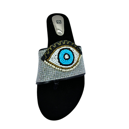 Evil Eye Embellished Women’s Slippers, Black and Silver, Beaded Design