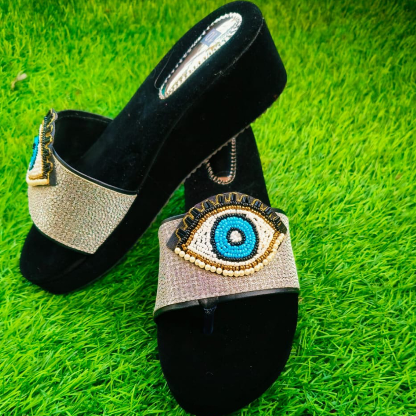 Make a bold fashion statement with these eye-catching women’s slippers that combine comfort with striking design elements. The black base provides an elegant foundation while the silver panel features an intricately crafted evil eye motif, beautifully enhanced with detailed beadwork and metallic embellishments. These slip-on sandals showcase meticulous craftsmanship with their eye-catching turquoise and gold colour scheme in the centrepiece design. The flat sole ensures all-day comfort, whilst the distinctive evil eye detail adds a unique conversation starter to your footwear collection. Perfect for casual outings or lounging at home, these slippers merge traditional symbolism with contemporary style. The contrast between the plush black base and the ornate silver panel creates a versatile look that complements various outfits. These slippers aren’t just fashionable accessories; they’re artistic pieces that bring a touch of mystique to your everyday wardrobe.
