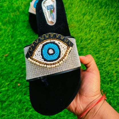 Be the first to review “Evil Eye Embellished Women’s Slippers, Black and Silver, Beaded Design”